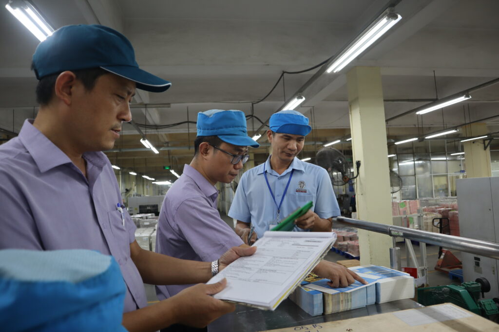 Sau buổi họp khai mạc, đoàn đánh giá đã tham quan thực tế các phân xưởng và dây chuyền sản xuất, quan sát cơ sở vật chất, quy trình vận hành, kiểm soát vệ sinh và môi trường làm việc. Bên cạnh đó, đánh giá viên còn tiến hành phỏng vấn thành viên nhóm HACCP, kiểm tra tài liệu quản lý, hồ sơ quy trình và hệ thống theo dõi kiểm soát mối nguy. Kết quả đánh giá ghi nhận Công ty Cổ phần In bao bì Khatoco đã thể hiện những bước tiến rõ rệt so với kỳ đánh giá trước, đồng thời vẫn nhận diện một vài điểm cần khắc phục để phù hợp yêu cầu ngày càng khắt khe của tiêu chuẩn theo phiên bản mới.