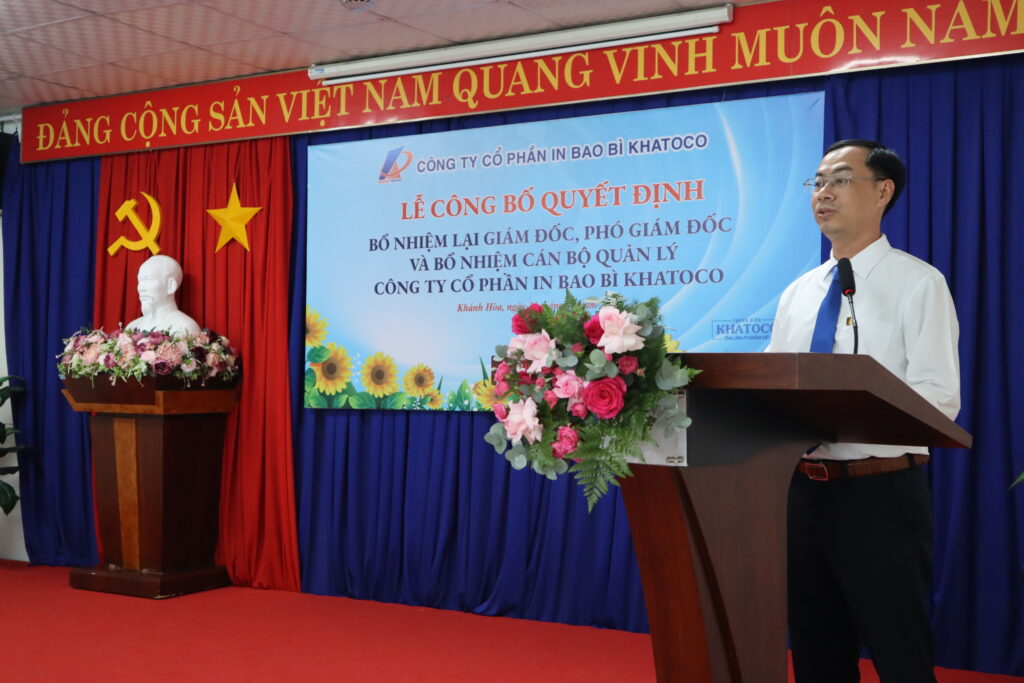 Phát biểu nhận nhiệm vụ, ông Phan Đặng Bình gửi lời cảm ơn đến Ban lãnh đạo Công ty đã tin tưởng giao trọng trách và hứa sẽ nỗ lực hết mình, phối hợp chặt chẽ cùng các phòng ban để hoàn thành tốt nhiệm vụ được giao. Buổi lễ khép lại trong không khí vui tươi và phấn khởi. Toàn thể Ban lãnh đạo và cán bộ chủ chốt đã cùng nhau chụp ảnh lưu niệm, ghi dấu một dấu mốc quan trọng trên hành trình phát triển của Công ty Cổ phần In bao bì Khatoco.