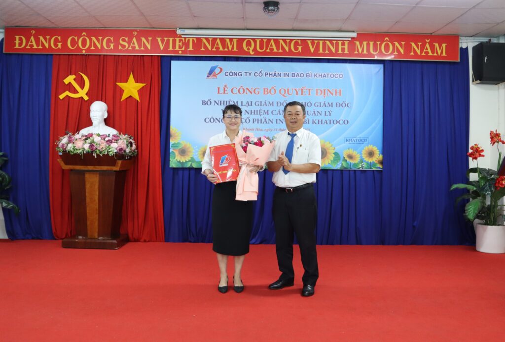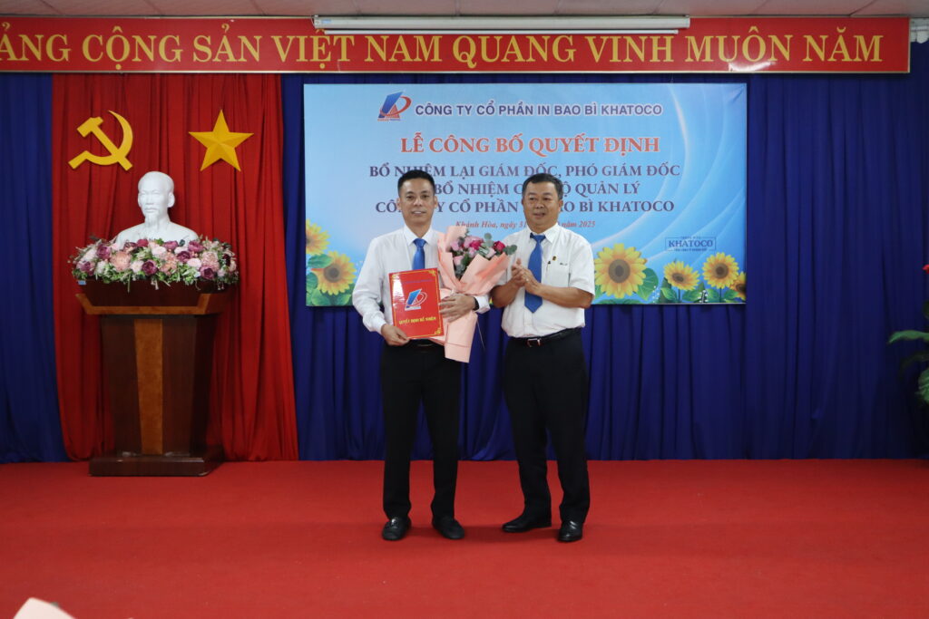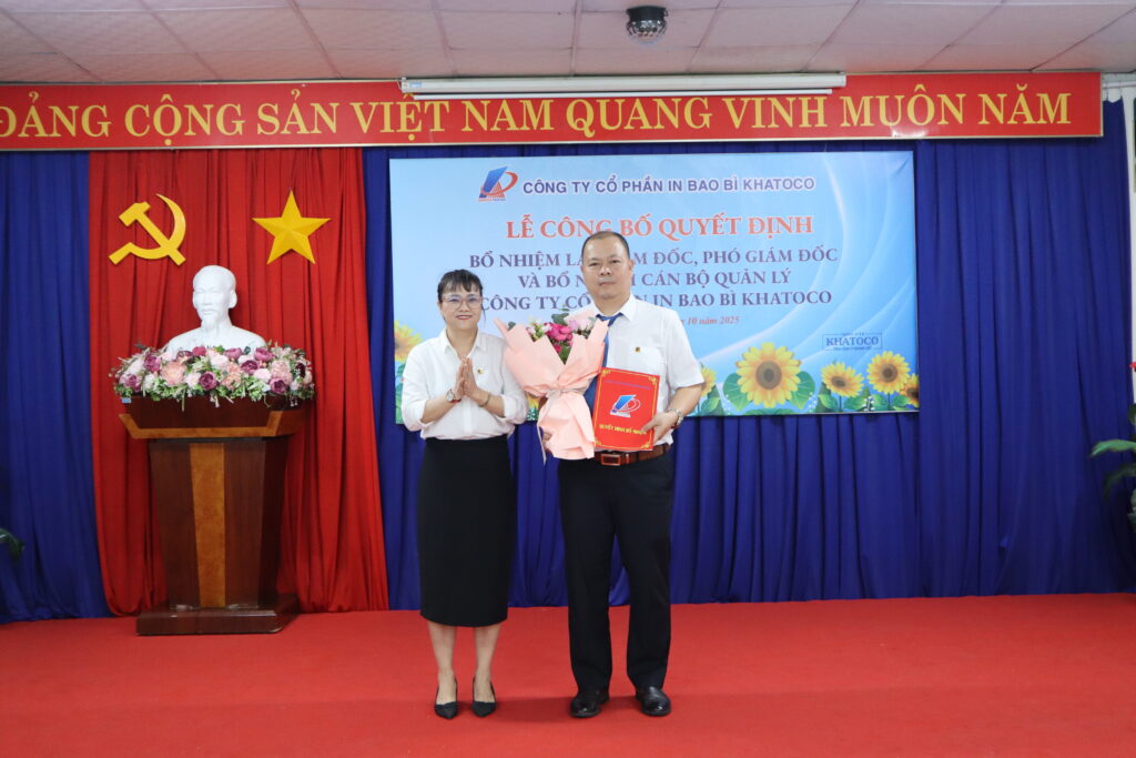Chiều ngày 31/10/2025, tại Hội trường Công ty Cổ phần In bao bì Khatoco, buổi Lễ công bố Quyết định bổ nhiệm lại Giám đốc, Phó Giám đốc và bổ nhiệm Phó phòng Vật tư đã diễn ra trong không khí trang trọng và ấm áp.